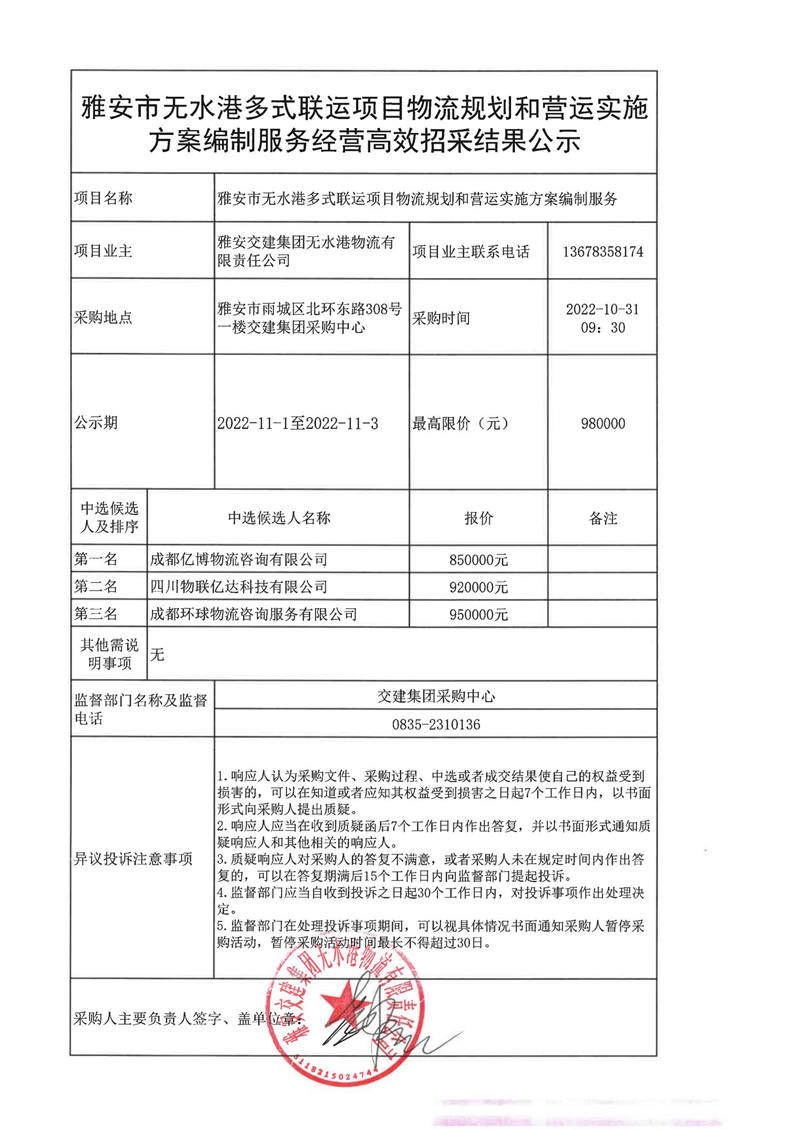 雅安交建集團無水港物流有限責任公司雅安市無水港多式聯(lián)運項目物流規(guī)劃和營運實施方案編制服務經(jīng)營高效招采結(jié)果公示