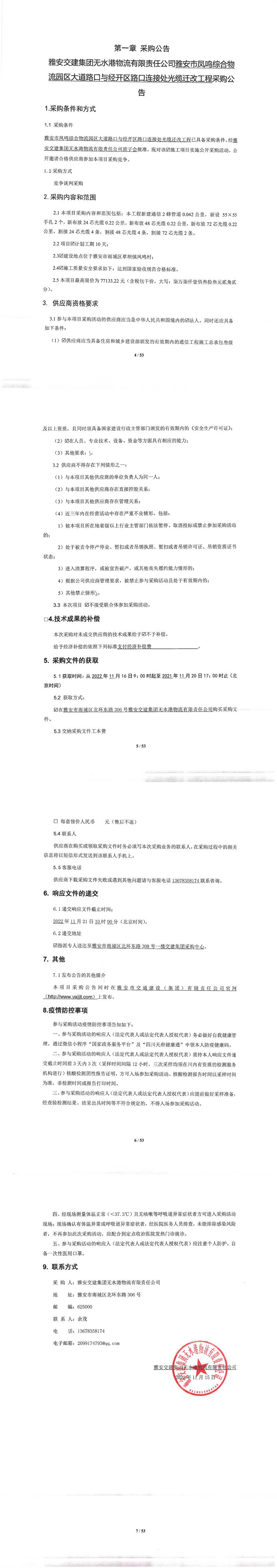 雅安交建集團(tuán)無(wú)水港物流有限責(zé)任公司雅安市鳳鳴綜合物流園區(qū)大道路口與經(jīng)開區(qū)路口連接處光纜遷改工程采購(gòu)公告