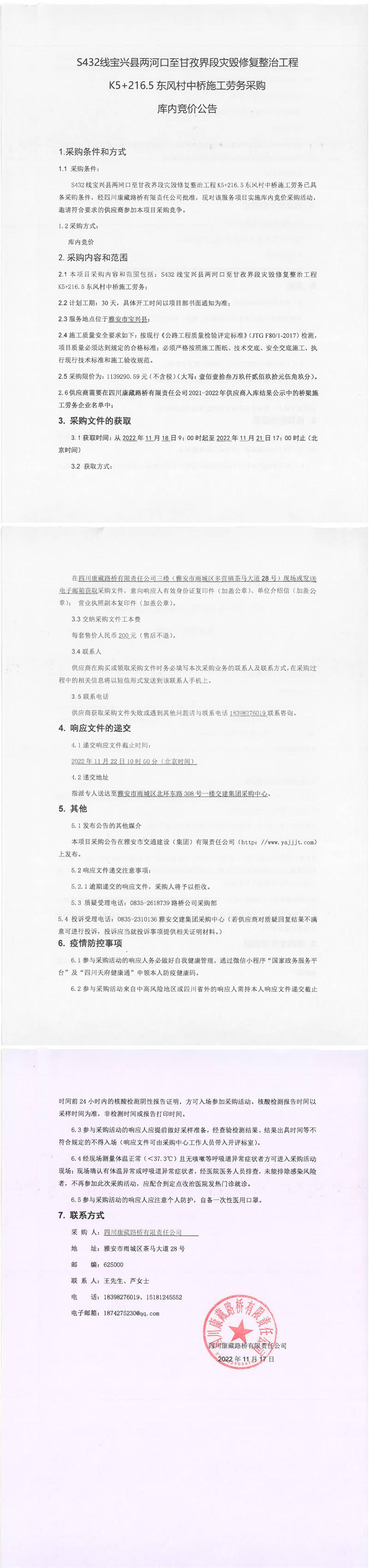 四川康藏路橋有限責(zé)任公司S432線寶興縣兩河口至甘孜界段災(zāi)毀修復(fù)整治工程K5+216.5東風(fēng)村中橋施工勞務(wù)采購庫內(nèi)競(jìng)價(jià)公告