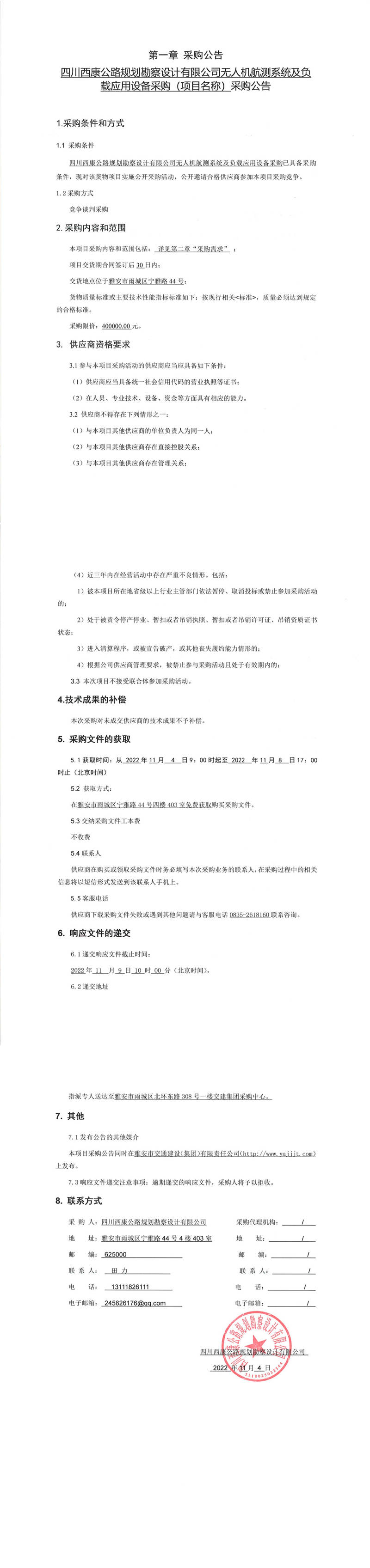 四川西康公路規(guī)劃勘察設(shè)計(jì)有限公司無人機(jī)航測系統(tǒng)及負(fù)載應(yīng)用設(shè)備采購(項(xiàng)目名稱)采購公告