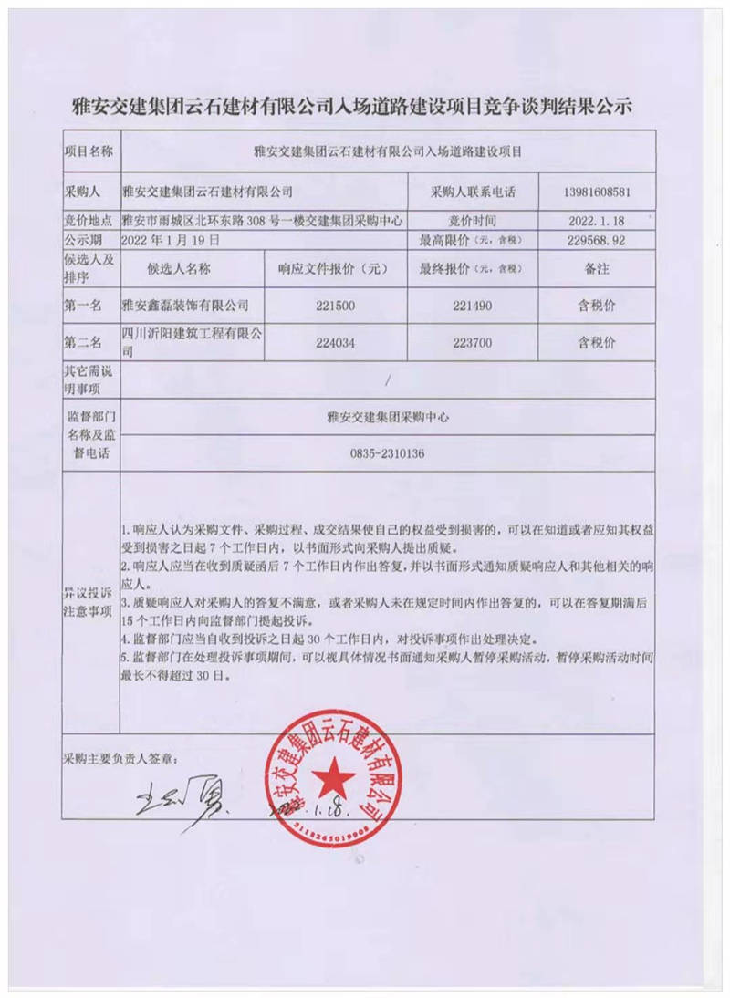 雅安交建集團(tuán)云石建材有限公司入場道路建設(shè)項目競爭談判結(jié)果公示