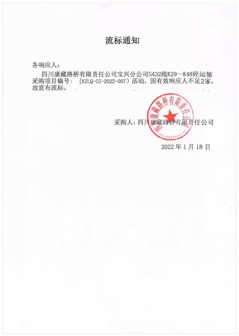 四川康藏路橋有限責(zé)任公司寶興分公司S432線K29-K48砼運(yùn)輸采購項目流標(biāo)通知