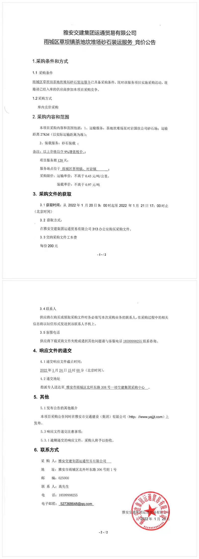 雅安交建集團運通貿(mào)易有限公司雨城區(qū)草壩鎮(zhèn)茶地坎堆場砂石裝運服務競價公告