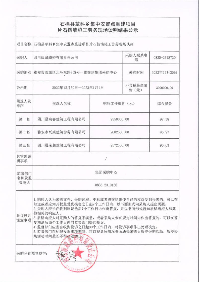 四川康藏路橋有限責任公司石棉縣草科鄉(xiāng)集中安置點重建項目片石擋墻施工勞務現(xiàn)場談判結(jié)果公示