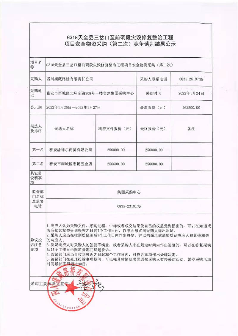 四川康藏路橋有限責任公司G318天全縣三岔口至前碉段災毀修復整治工程項目安全物資采購(第二次)競爭談判結果公示