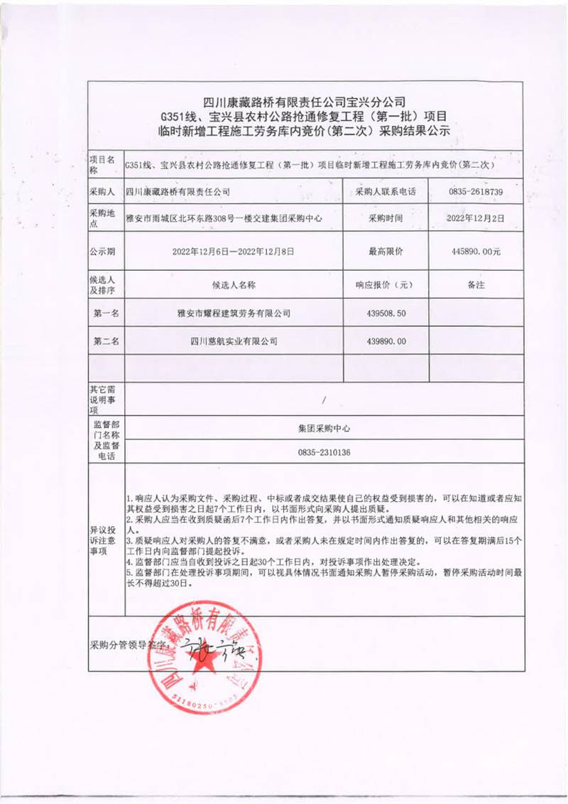 四川康藏路橋有限責(zé)任公司寶興分公司G351線、寶興縣農(nóng)村公路搶通修復(fù)工程(第一批)項目臨時新增工程施工勞務(wù)庫內(nèi)競價(第二次)采購結(jié)果公示