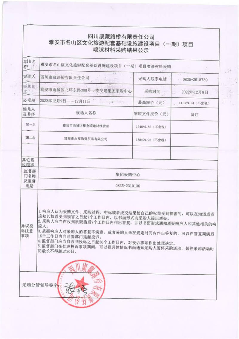 四川康藏路橋有限責(zé)任公司雅安市名山區(qū)文化旅游配套基礎(chǔ)設(shè)施建設(shè)項(xiàng)目(一期)項(xiàng)目噴漆材料采購結(jié)果公示