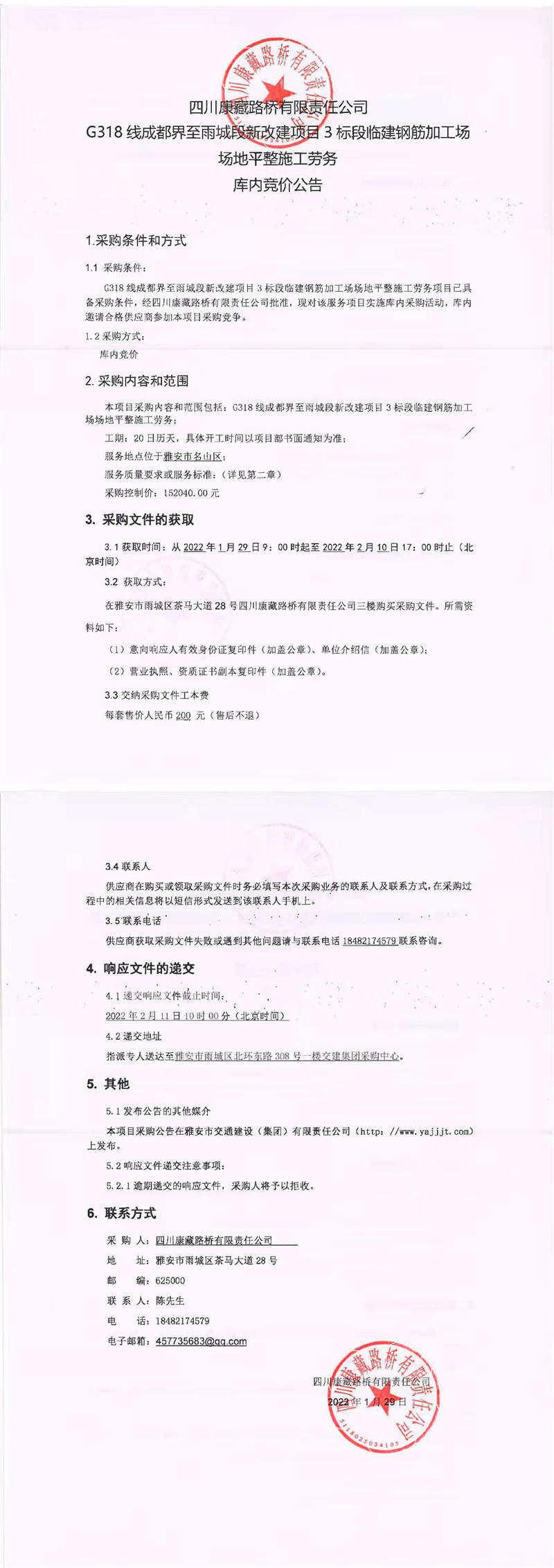 四川康藏路橋有限責(zé)任公司G318線成都界至雨城段新改建項(xiàng)目3標(biāo)段臨建鋼筋加工場場地平整施工勞務(wù)庫內(nèi)競價(jià)公告