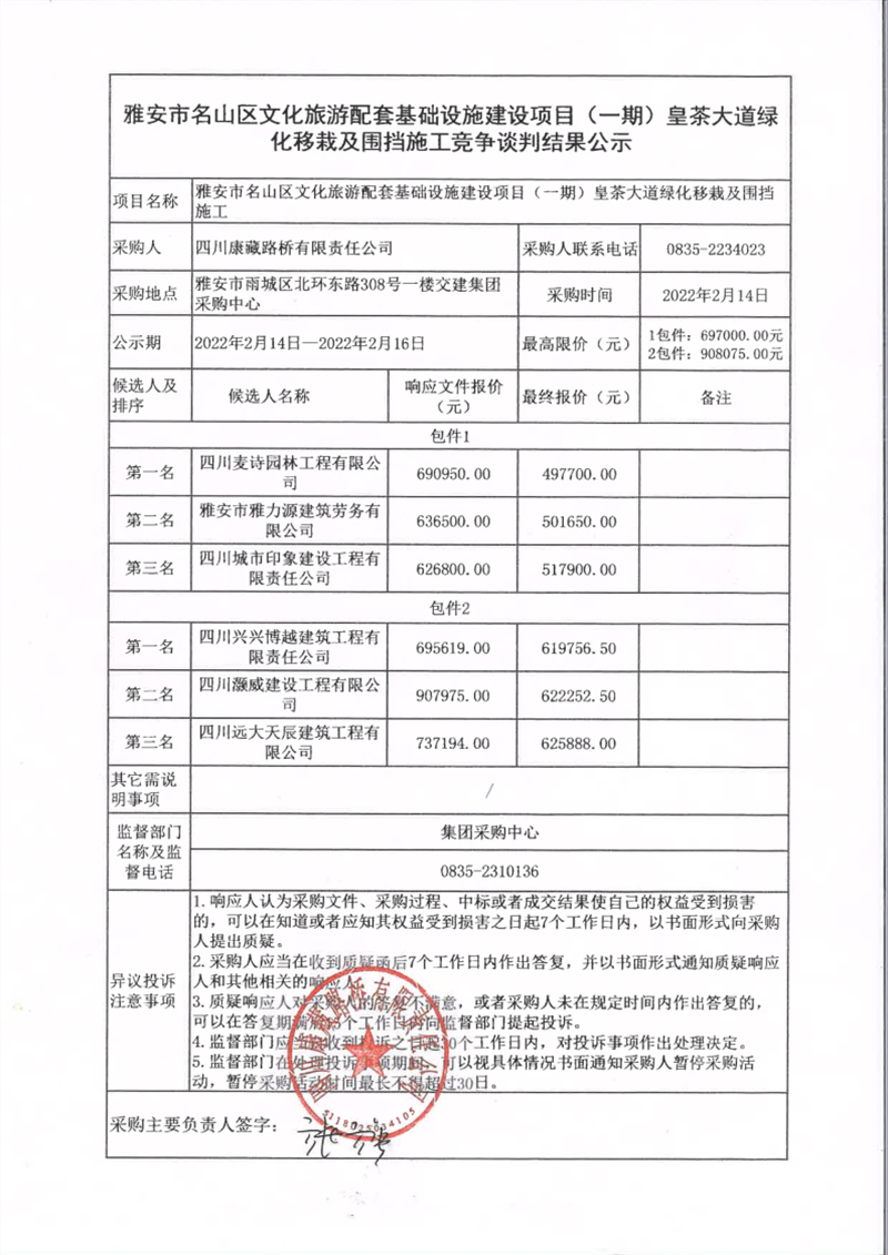 四川康藏路橋有限責任公司雅安市名山區(qū)文化旅游配套基礎(chǔ)設(shè)施建設(shè)項目(一期)皇茶大道綠化移栽及圍擋施工競爭談判結(jié)果公示