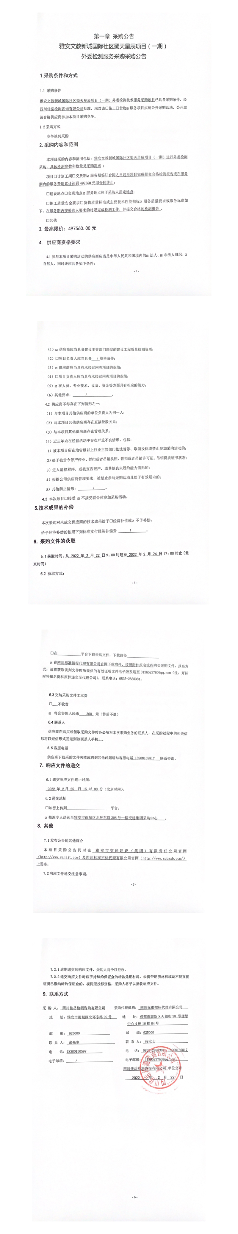 四川佳岳檢測咨詢有限公司雅安文教新城國際社區(qū)蜀天星辰項目(一期)外委檢測服務采購采購公告