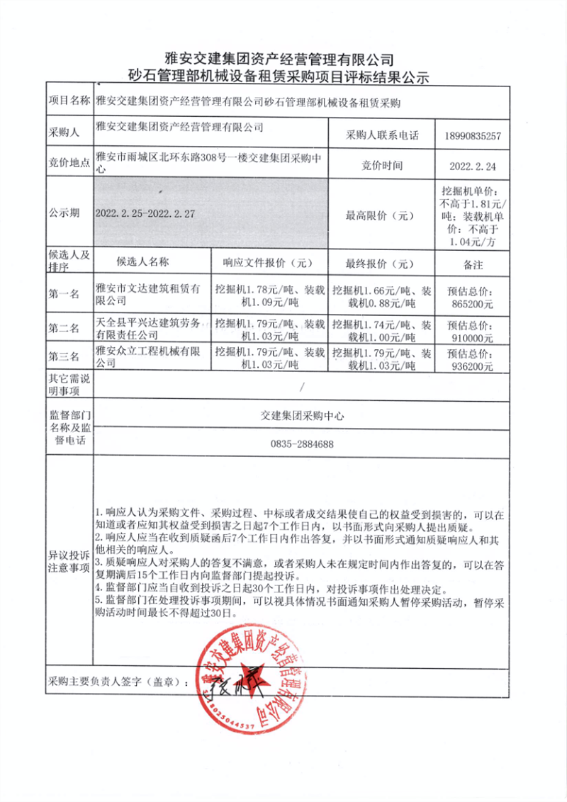 雅安交建集團(tuán)資產(chǎn)經(jīng)營(yíng)管理有限公司砂石管理部機(jī)械設(shè)備租賃采購項(xiàng)目評(píng)標(biāo)結(jié)果公示