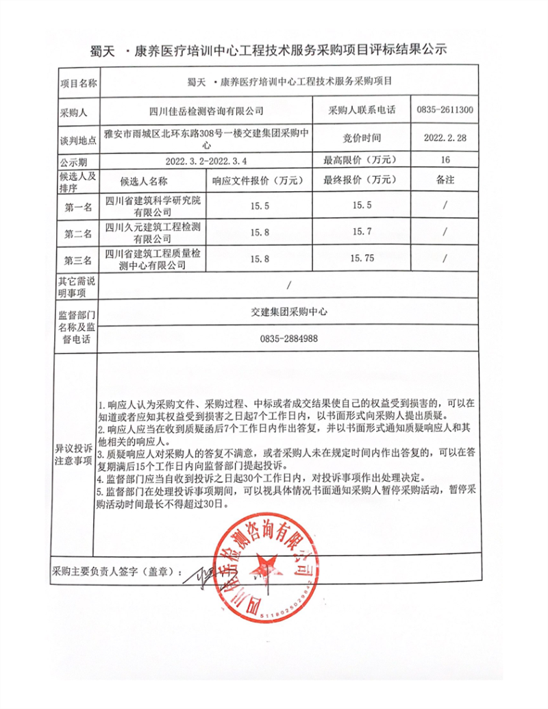 四川佳岳檢測咨詢有限公司蜀天.康養(yǎng)醫(yī)療培訓(xùn)中心工程技術(shù)服務(wù)采購項目評標結(jié)果公示