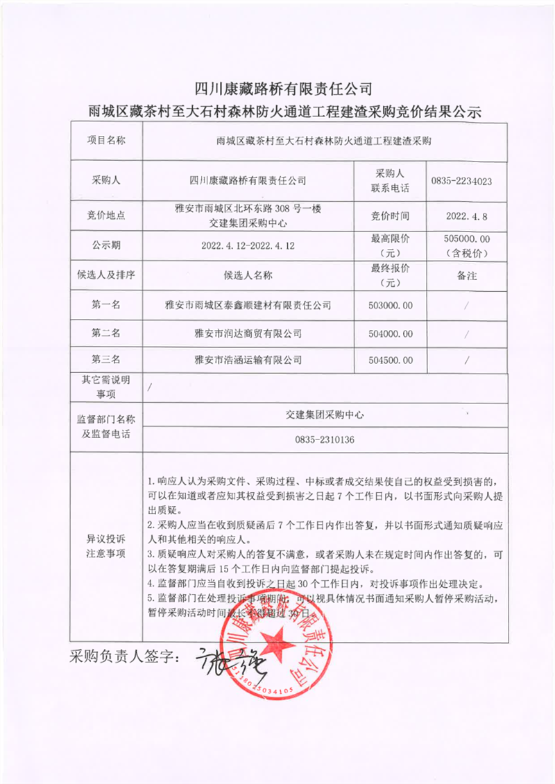 四川康藏路橋有限責任公司雨城區(qū)藏茶村至大石村森林防火通道工程建渣采購競價結果公示