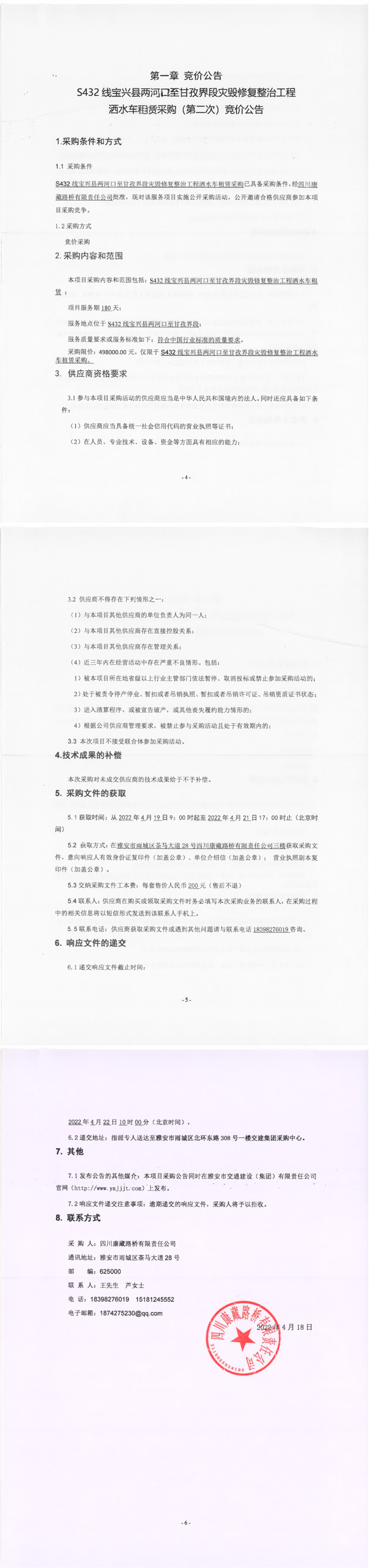 四川康藏路橋有限責任公司S432線寶興縣兩河口至甘孜界段災(zāi)毀修復(fù)整治工程灑水車租賃采購(第二次)競價公告