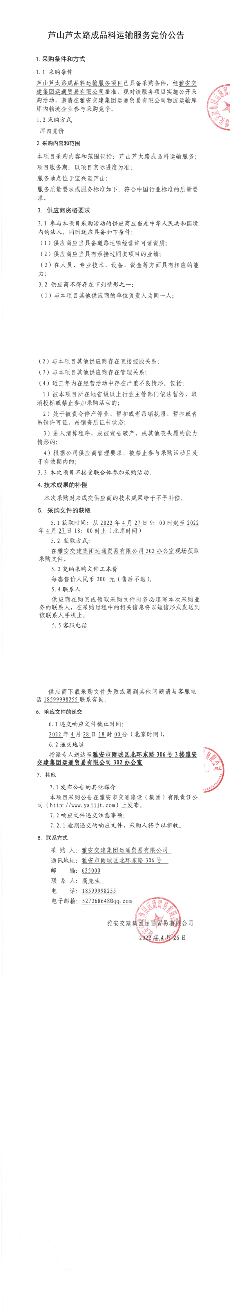 雅安交建集團運通貿(mào)易有限公司蘆山蘆太路成品料運輸服務(wù)競價公告