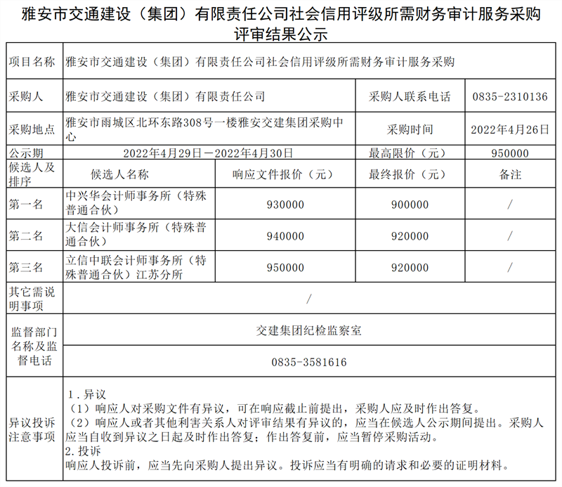雅安市交通建設(集團)有限責任公司社會信用評級所需財務審計服務采購評審結(jié)果公示