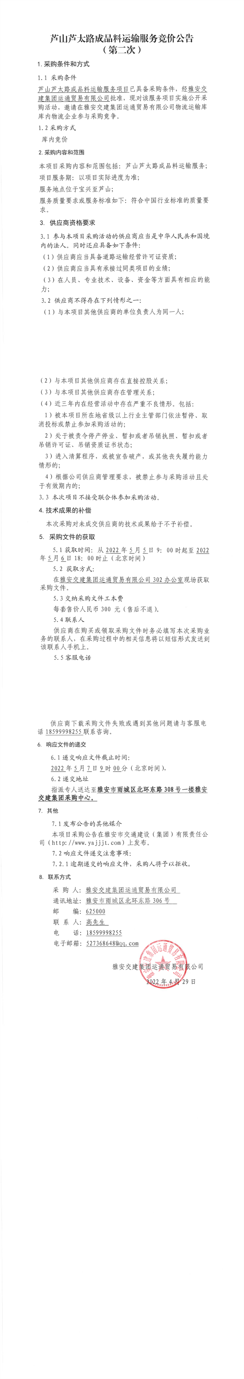 雅安交建集團運通貿(mào)易有限公司蘆山蘆太路成品料運輸服務競價公告(第二次)