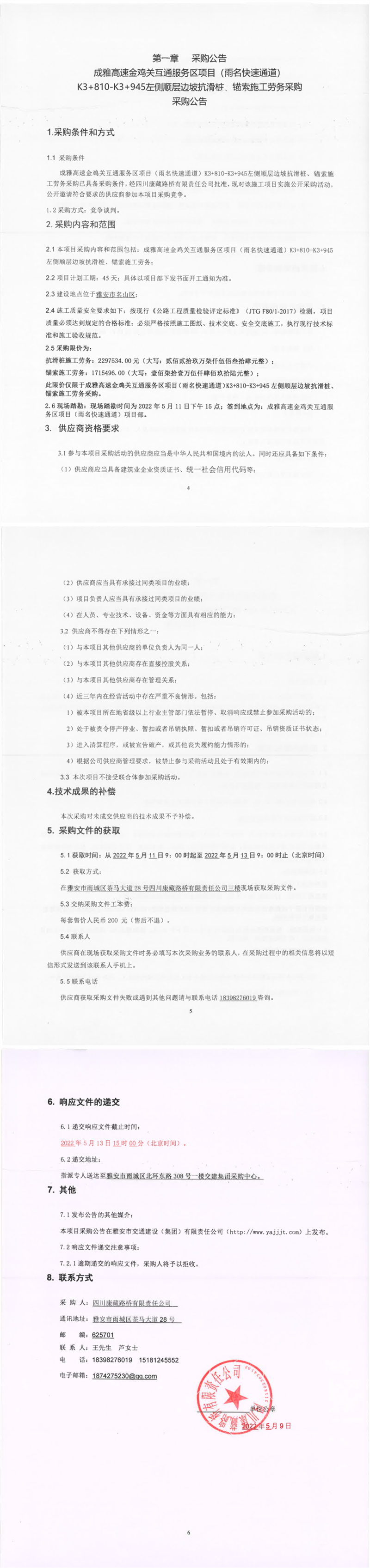 四川康藏路橋有限責任公司成雅高速金雞關互通服務區(qū)項目(雨名快速通道)K3+810-K3+945左側順層邊坡抗滑樁、錨索施工勞務采購采購公告