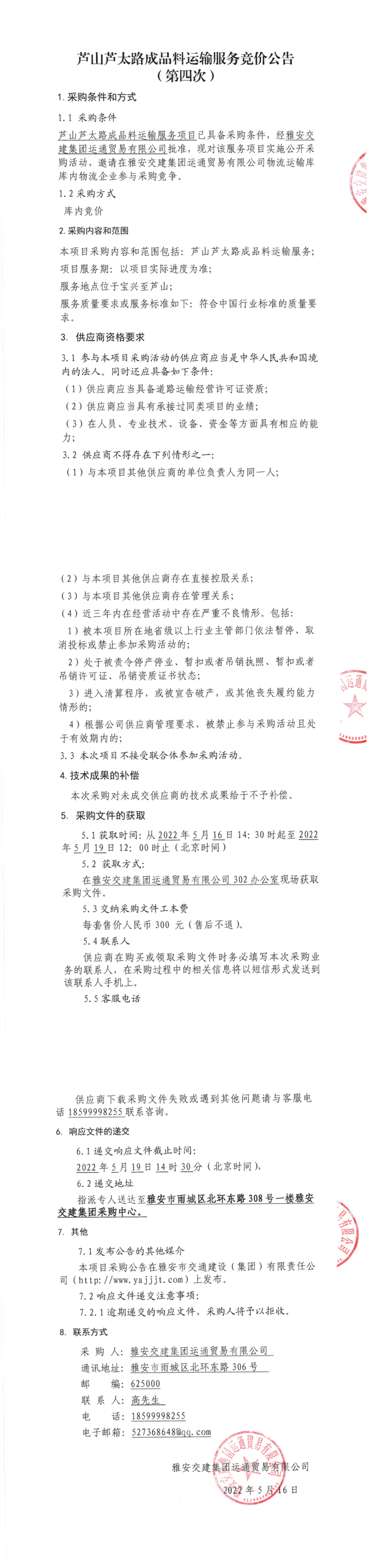 雅安交建集團運通貿(mào)易有限公司蘆山蘆太路成品料運輸服務競價公告(第四次)