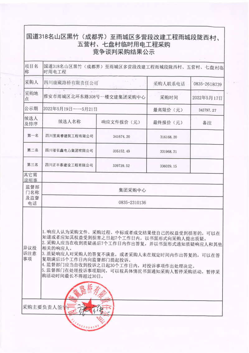 四川康藏路橋有限責(zé)任公司國道318名山區(qū)黑竹(成都界)至雨城區(qū)多營段改建工程雨城段隴西村、五營村、七盤村臨時用電工程采購競爭談判結(jié)果公示