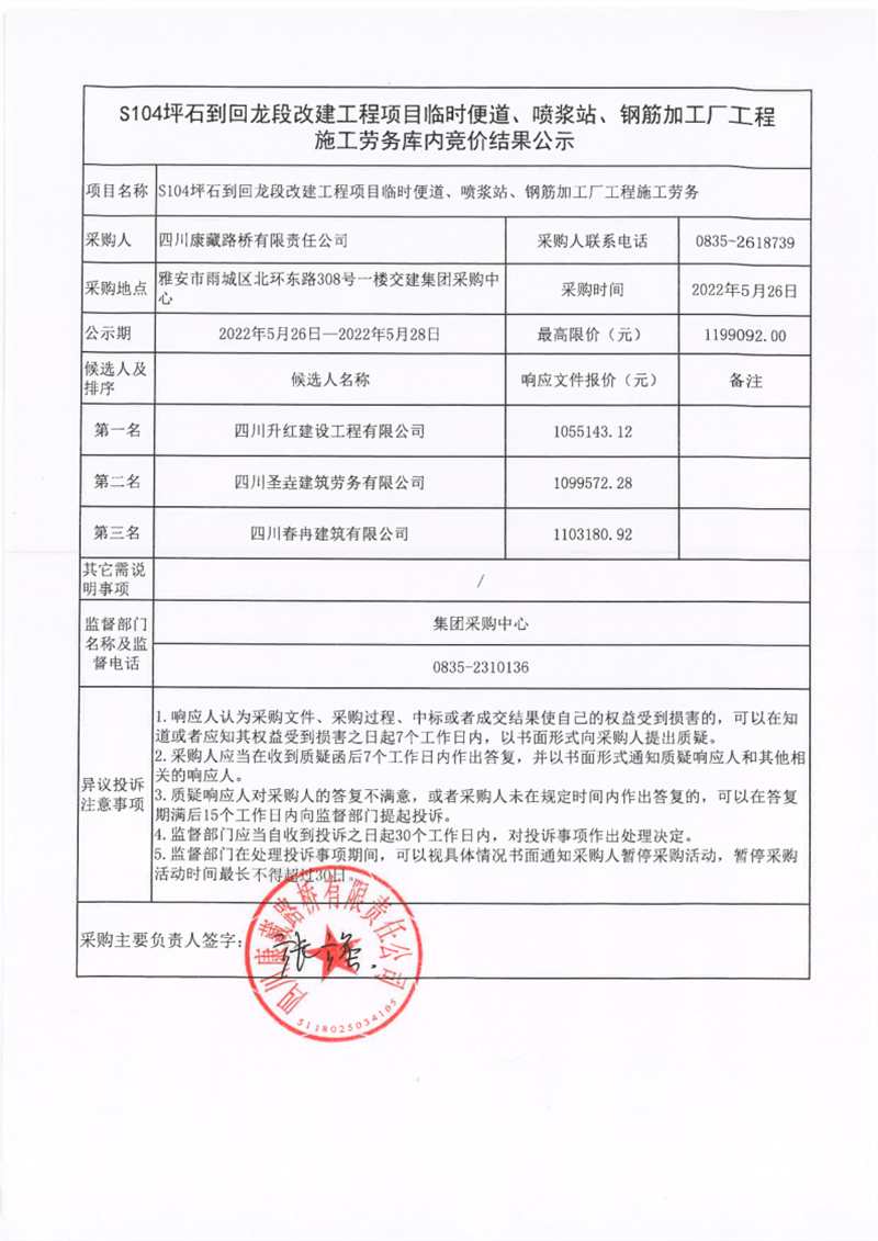 四川康藏路橋有限責(zé)任公司S104坪石到回龍改建工程項(xiàng)目臨時(shí)便道、噴漿站、鋼筋加工廠工程施工勞務(wù)庫(kù)內(nèi)競(jìng)價(jià)結(jié)果公示