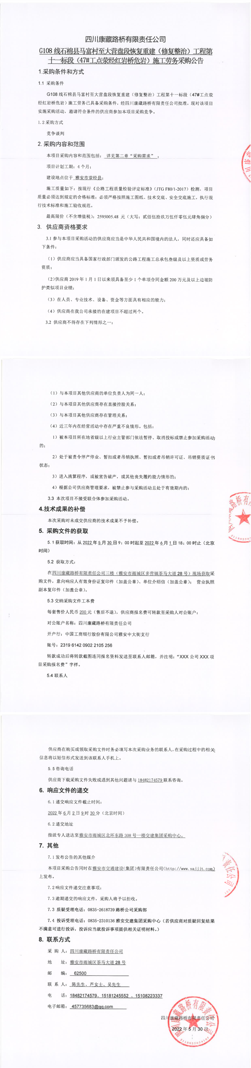 四川康藏路橋有限責(zé)任公司G108線石棉縣馬富村至大營盤段恢復(fù)重建(修復(fù)整治)工程第十一標段(47#工點滎經(jīng)紅巖橋危巖)施工勞務(wù)采購公告