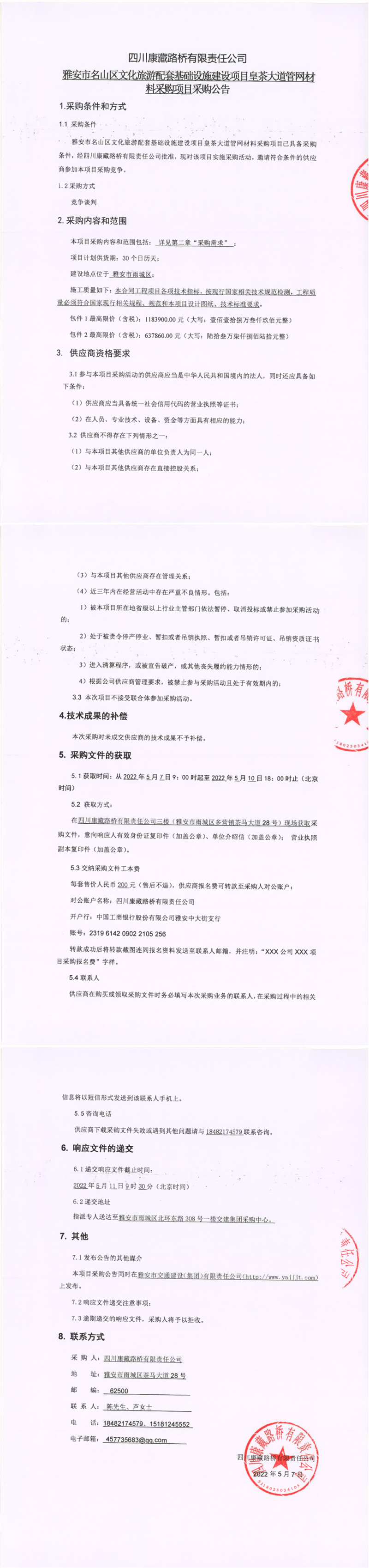 四川康藏路橋有限責(zé)任公司雅安市名山區(qū)文化旅游配套基礎(chǔ)設(shè)施建設(shè)項(xiàng)目皇茶大道管網(wǎng)材料采購(gòu)項(xiàng)目采購(gòu)公告