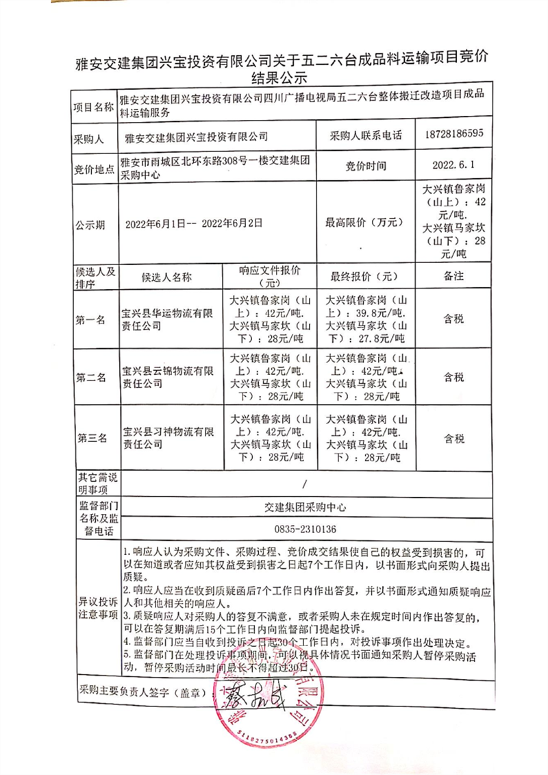 雅安交建集團(tuán)興寶投資有限公司關(guān)于五二六臺(tái)成品料運(yùn)輸項(xiàng)目競價(jià)結(jié)果公示