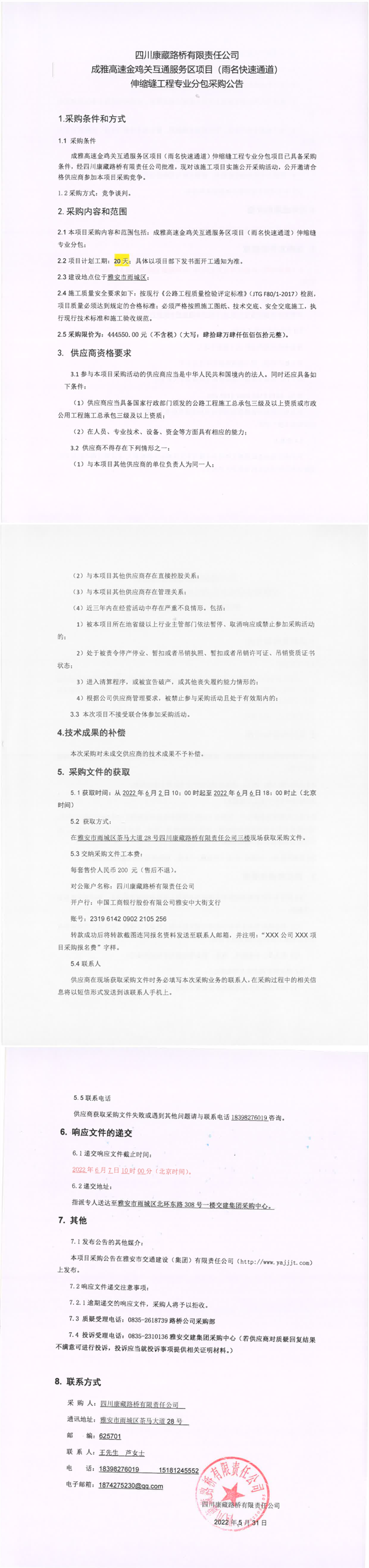 四川康藏路橋有限責任公司成雅高速金雞關(guān)互通服務(wù)區(qū)項目(雨名快速通道)伸縮縫工程專業(yè)分包采購公告
