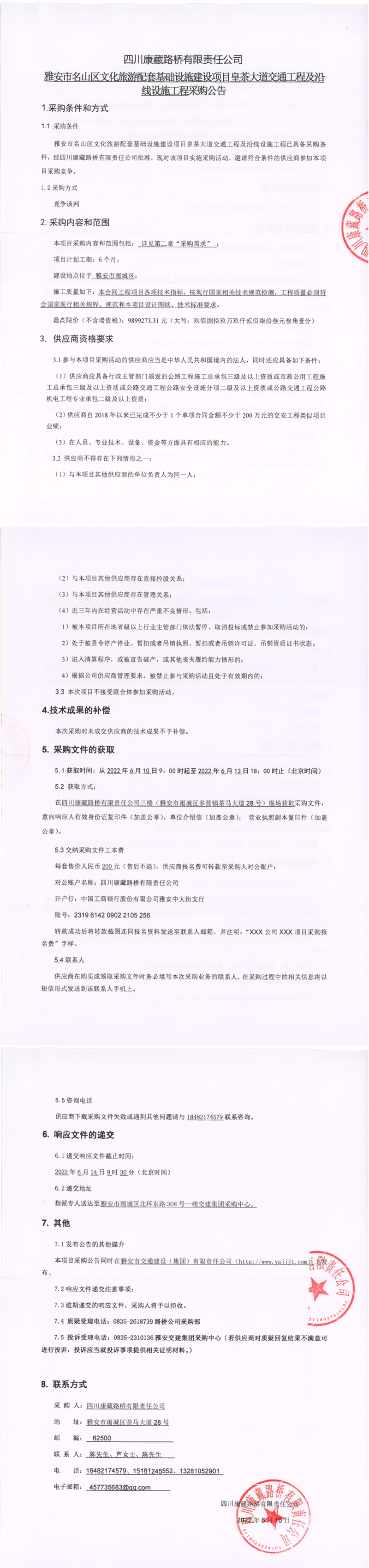 四川康藏路橋有限責(zé)任公司雅安市名山區(qū)文化旅游配套基礎(chǔ)設(shè)施建設(shè)項(xiàng)目皇茶大道交通工程及沿線設(shè)施工程采購(gòu)公告