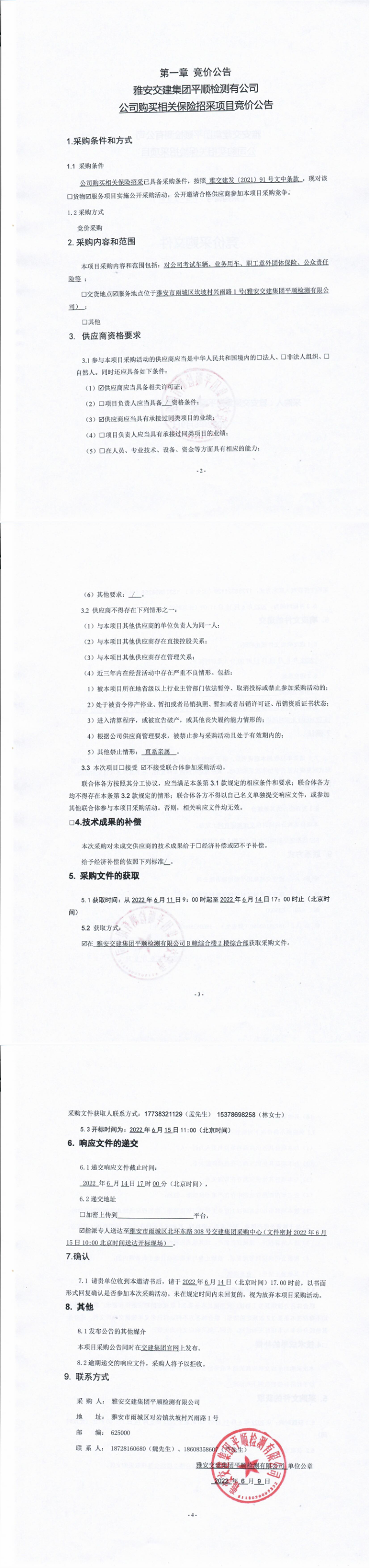 雅安交建集團(tuán)平順檢測(cè)有限公司公司購買相關(guān)保險(xiǎn)招采項(xiàng)目競(jìng)價(jià)公告
