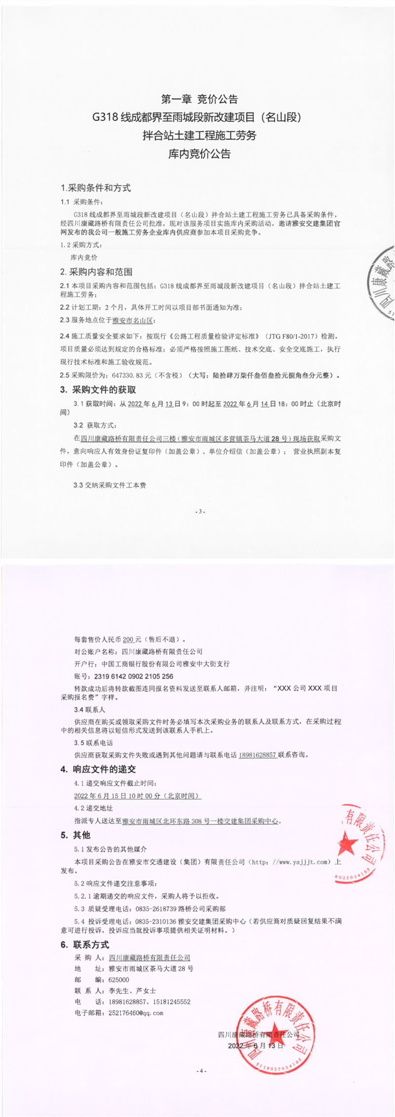 四川康藏路橋有限責(zé)任公司G318線(xiàn)成都界至雨城段新改建項(xiàng)目(名山段)拌合站土建工程施工勞務(wù)庫(kù)內(nèi)競(jìng)價(jià)公告