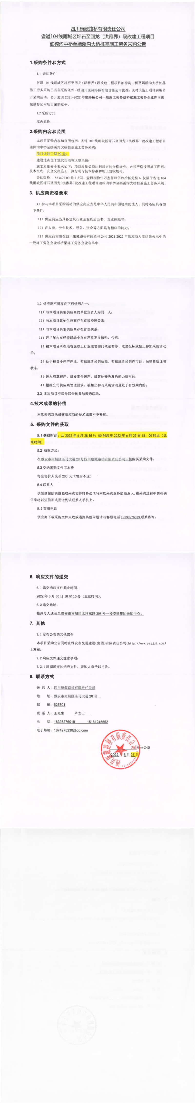 四川康藏路橋有限責(zé)任公司省道104線雨城區(qū)坪石至回龍(洪雅界)段改建工程項(xiàng)目錢(qián)壩大橋、望魚(yú)大橋樁基及鋼便橋工程施工勞務(wù)采購(gòu)公告