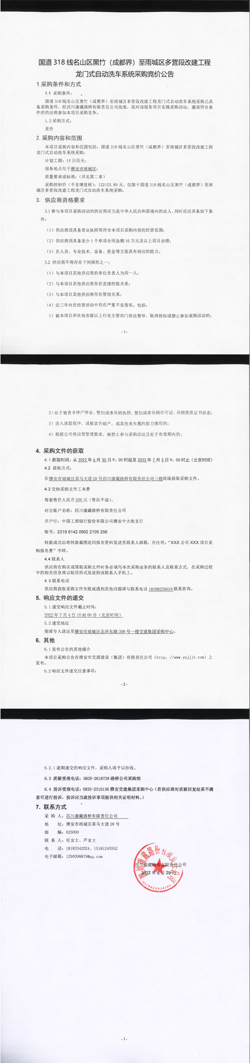 四川康藏路橋有限責(zé)任公司國道318線名山區(qū)黑竹(成都界)至雨城區(qū)多營段改建工程龍門式自動(dòng)洗車系統(tǒng)采購競價(jià)公告