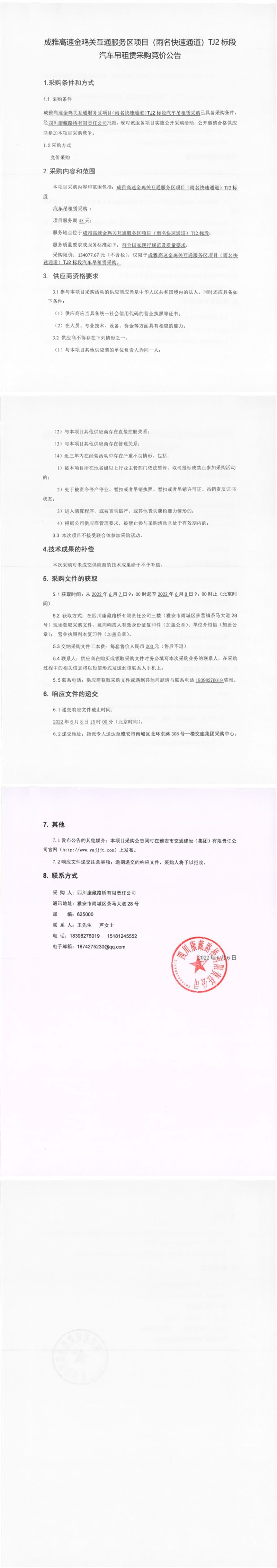 四川康藏路橋有限責任公司成雅高速金雞關(guān)互通服務(wù)區(qū)項目(雨名快速通道)TJ2標段汽車吊租賃采購競價公告