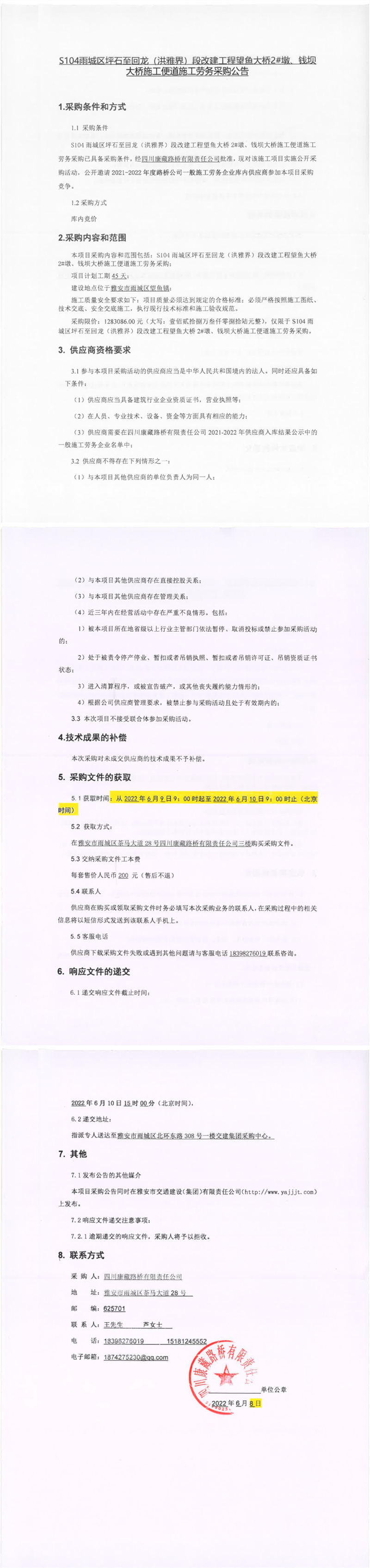 四川康藏路橋有限責(zé)任公司S104雨城區(qū)坪石至回龍(洪雅界)段改建工程望魚大橋2#墩、錢壩大橋施工便道施工勞務(wù)采購(gòu)公告