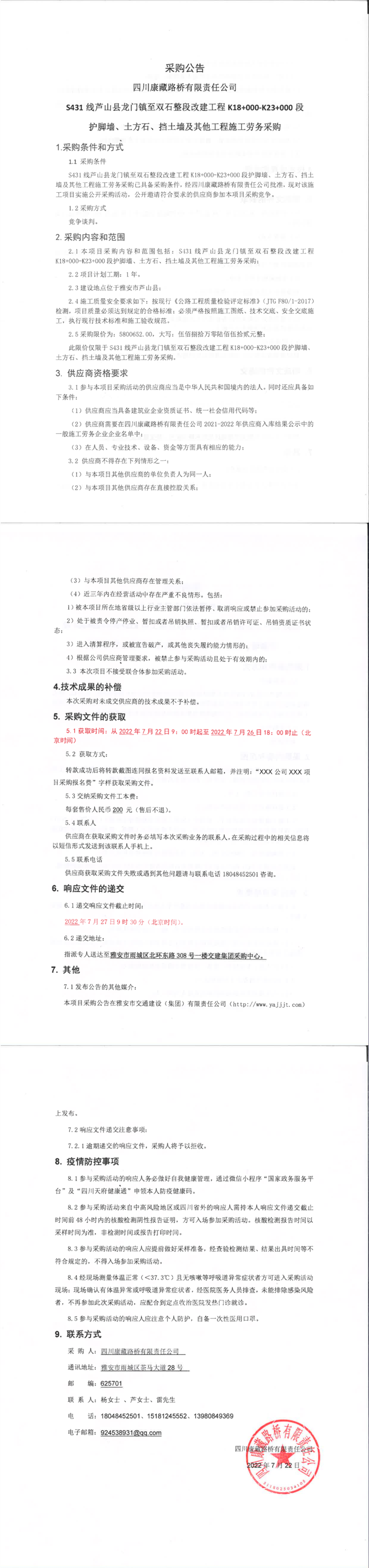 四川康藏路橋有限責(zé)任公司S431線蘆山縣龍門鎮(zhèn)至雙石整段改建工程K18+000-K23+000段護(hù)腳墻、土方石、擋土墻及其他工程施工勞務(wù)采購(gòu)