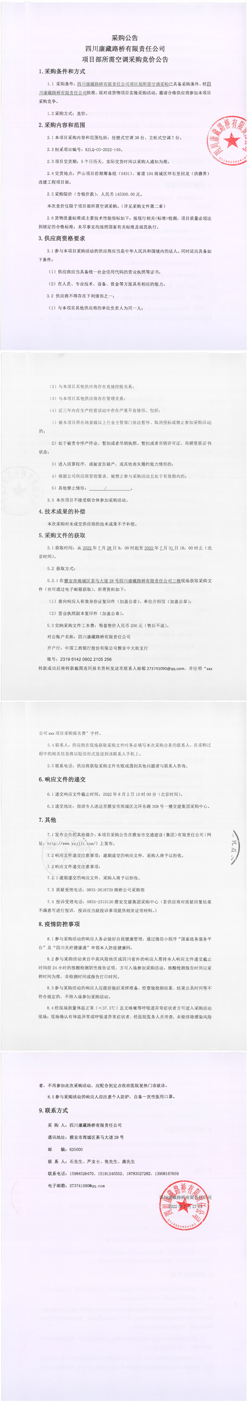 四川康藏路橋有限責(zé)任公司項目部所需空調(diào)采購競價公告
