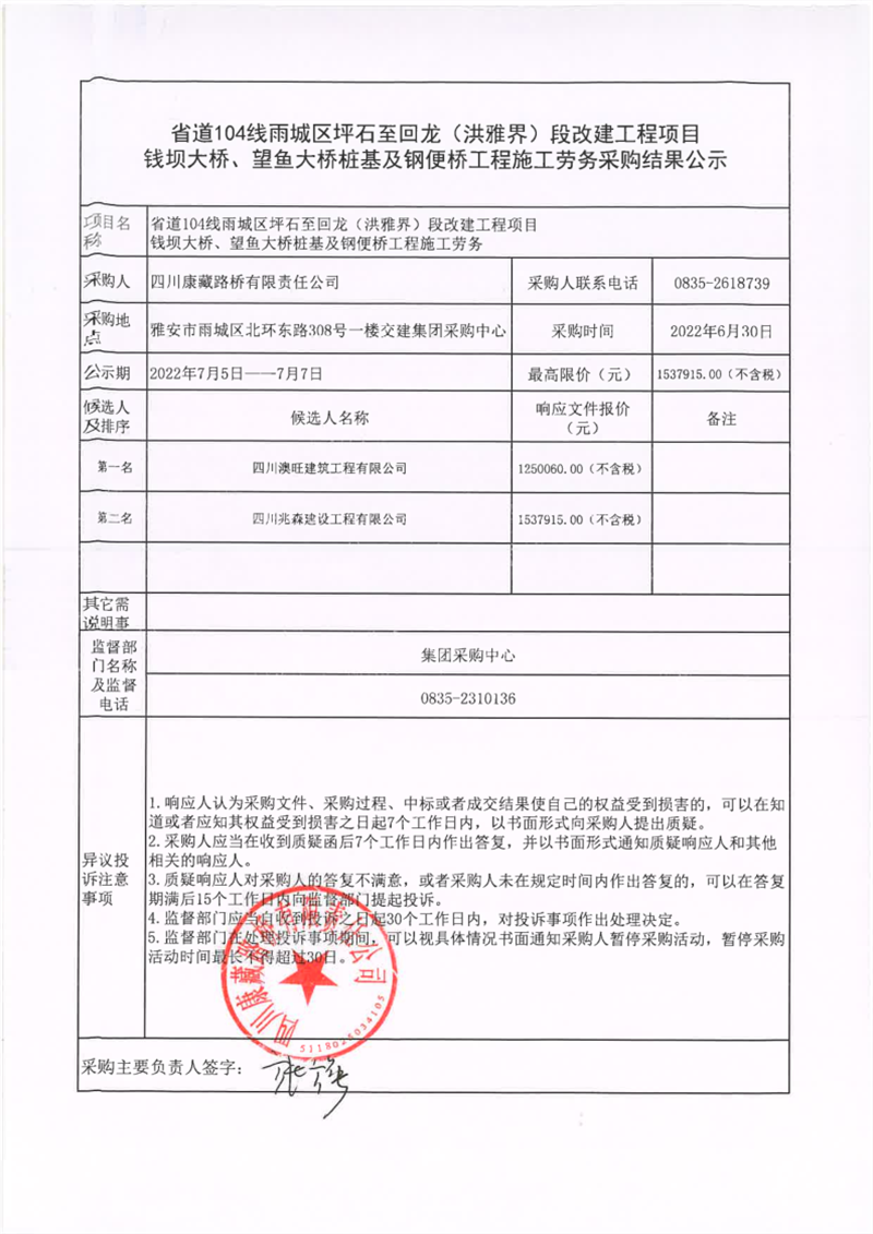 四川康藏路橋有限責任公司省道104線雨城區(qū)坪石至回龍(洪雅界)段改建工程項目錢壩大橋、望魚大橋樁基及鋼便橋工程施工勞務采購結(jié)果公示