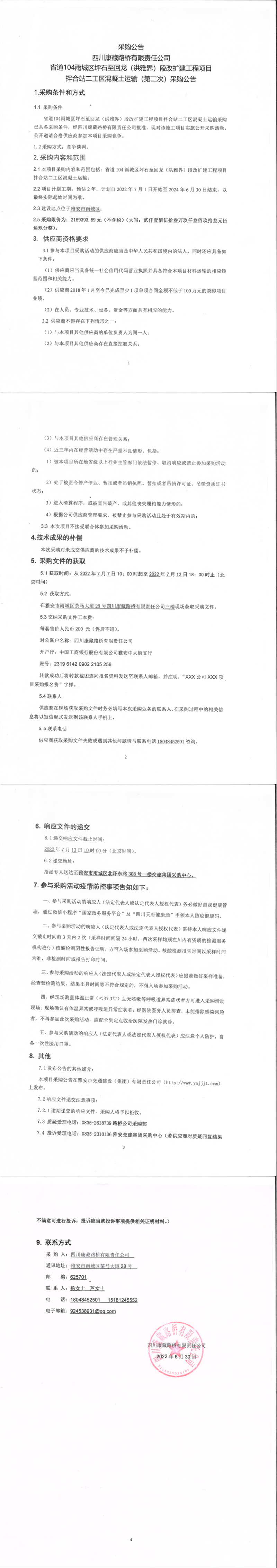 四川康藏路橋有限責任公司省道104雨城區(qū)坪石至回龍(洪雅界)段改建工程項目拌合站二工區(qū)混凝土運輸(第二次)采購公告