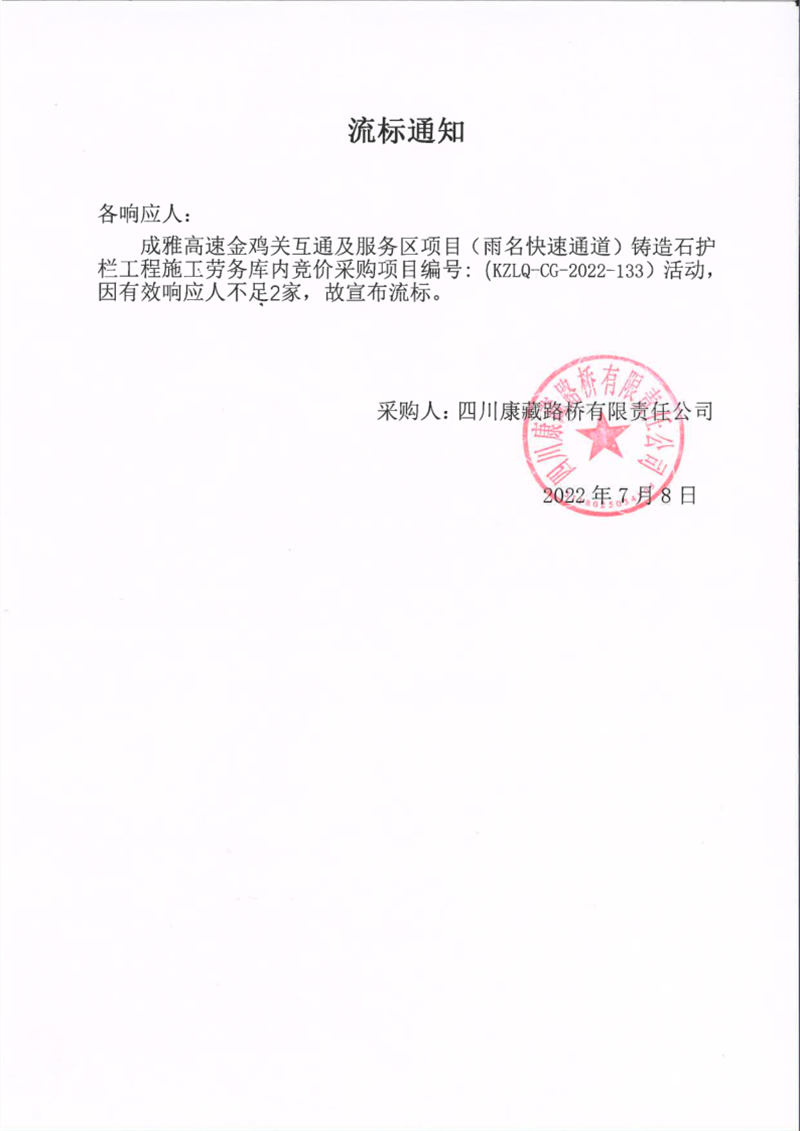 四川康藏路橋有限責(zé)任公司成雅高速金雞關(guān)互通及服務(wù)區(qū)項(xiàng)目(雨名快速通道)鑄造石護(hù)欄施工勞務(wù)庫內(nèi)競(jìng)價(jià)采購項(xiàng)目流標(biāo)通知