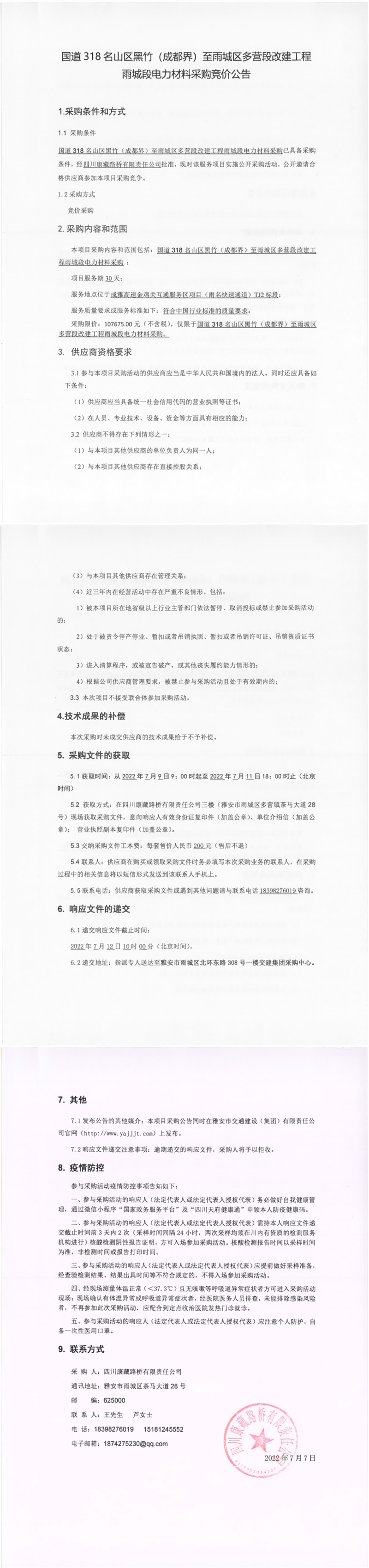 四川康藏路橋有限責(zé)任公司國道318名山區(qū)黑竹(成都界)至雨城區(qū)多營段改建工程雨城段電力材料采購競價(jià)公告