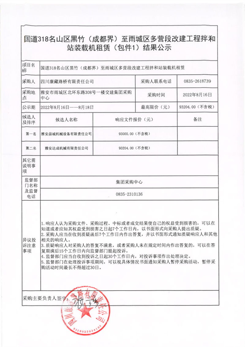 四川康藏路橋有限責(zé)任公司G318名山段項目拌合站水電材料采購結(jié)果公示
