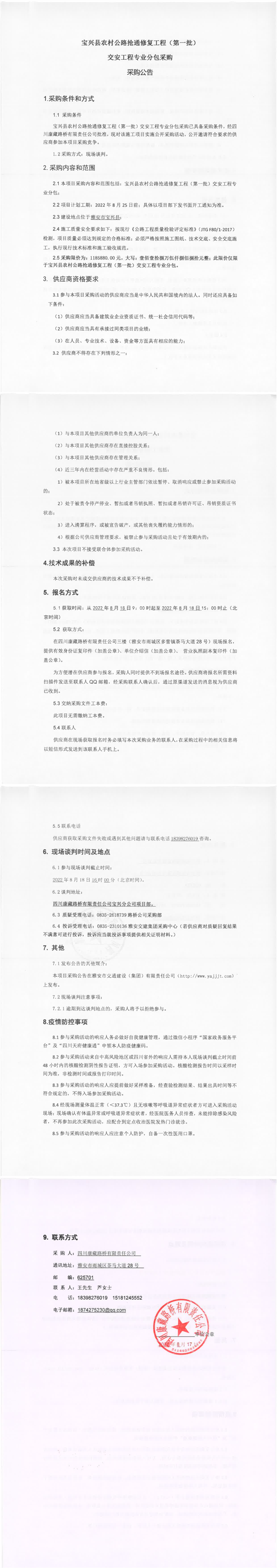 四川康藏路橋有限責任公司寶興縣農村公路搶通修復工程(第一批)交安工程專業(yè)分包采購采購公告
