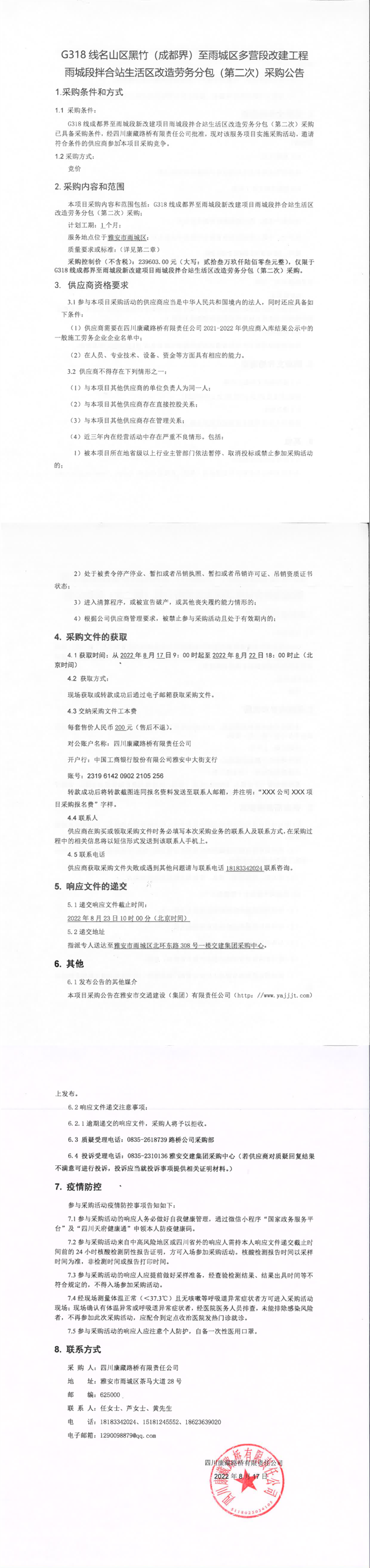 四川康藏路橋有限責(zé)任公司G318線名山區(qū)黑竹(成都界)至雨城區(qū)多營段改建工程雨城段拌合站生活區(qū)改造勞務(wù)分包(第二次)采購公告