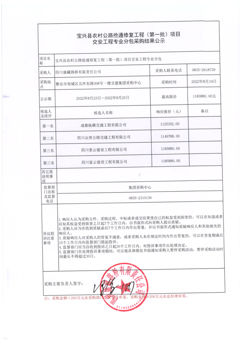 四川康藏路橋有限責任公司寶興縣農(nóng)村公路搶通修復工程(第一批)交安工程專業(yè)分包采購結(jié)果公示