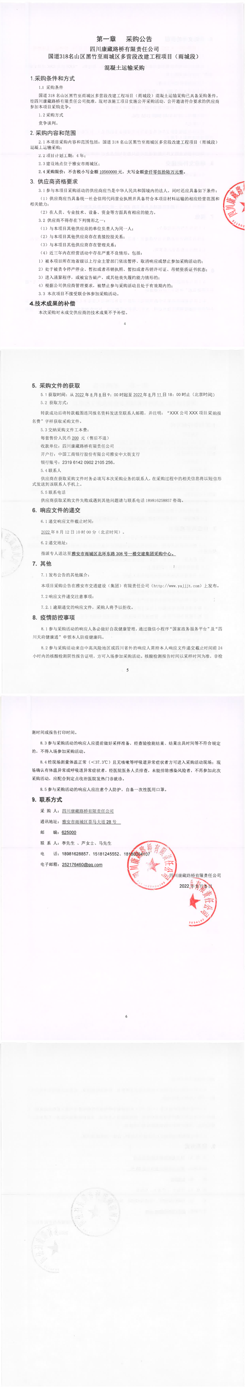 四川康藏路橋有限責(zé)任公司國道318名山區(qū)黑竹至雨城區(qū)多營段改建工程項目(雨城段)混凝土運輸采購公告
