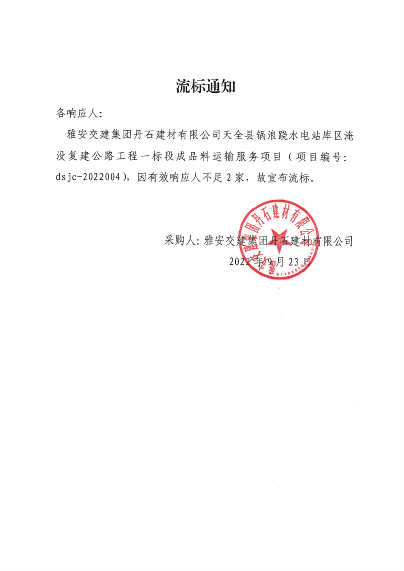 雅安交建集團(tuán)丹石建材有限公司天全縣鍋浪蹺水電站庫(kù)區(qū)淹沒(méi)復(fù)建公路工程一標(biāo)段成品料運(yùn)輸服務(wù)項(xiàng)目流標(biāo)通知