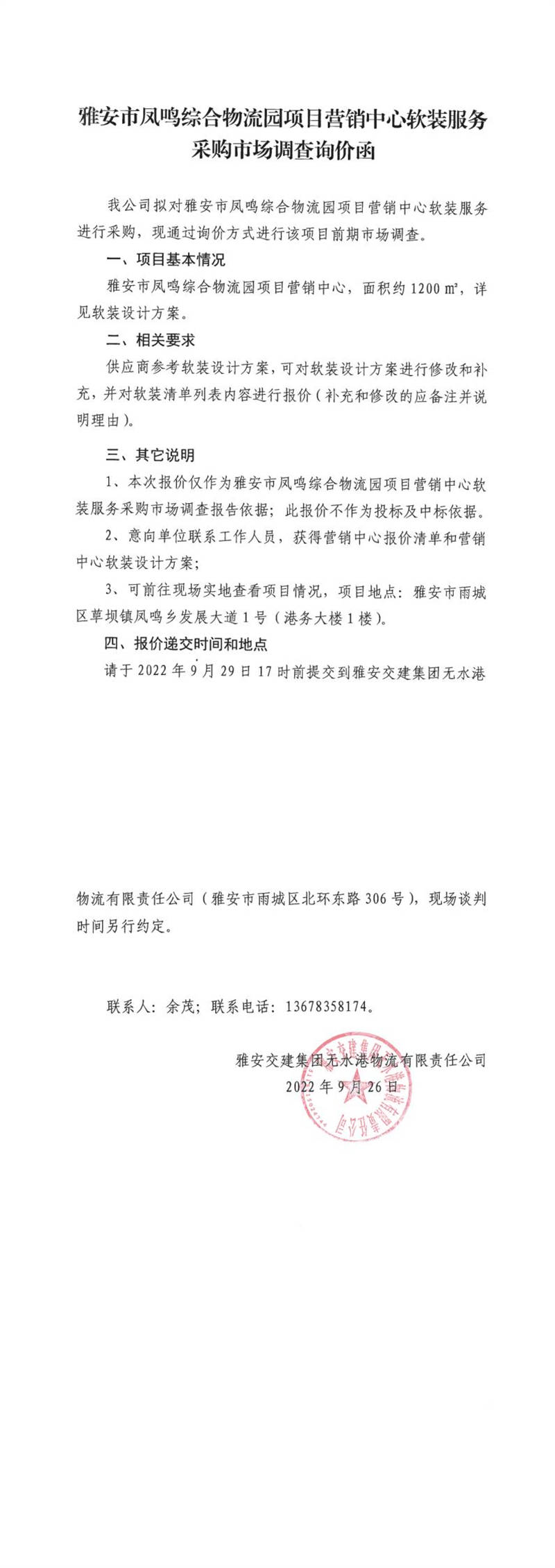 雅安交建集團(tuán)無水港物流有限責(zé)任公司雅安市鳳鳴綜合物流園項(xiàng)目營銷中心軟裝服務(wù)采購市場調(diào)查詢價函