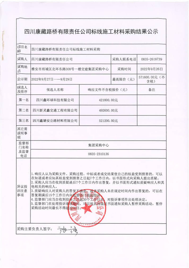 四川康藏路橋有限責(zé)任公司標(biāo)線施工材料采購結(jié)果公示